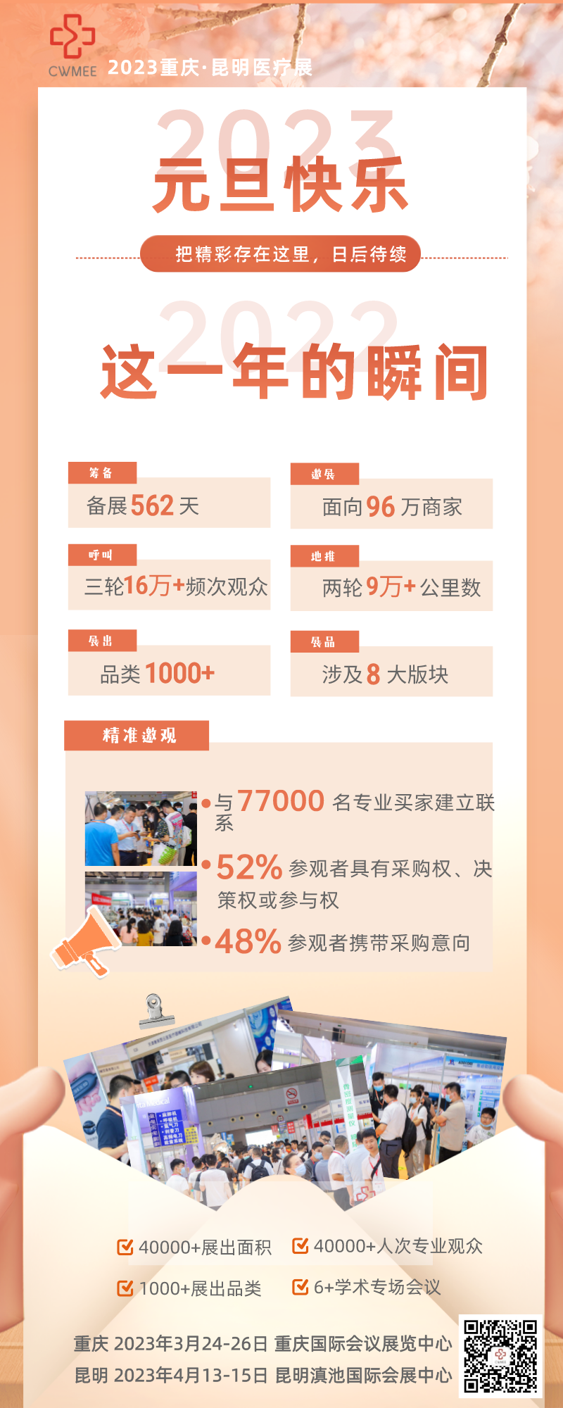 2023重庆·昆明医疗展将分别于2023年3月24-26日重庆国际会议展览中心、2023年4月13-15日昆明滇池国际会展中心召开,展出面积40000㎡、展商1000余家,预计吸引40000+人次专业观众到场参观,同期6+场专业学术会议,展示学术科研、融合市场供需,联动从源头到终端的产业链,为西南医疗市场构建产品展示、买卖成交、学术科研的行业信息平台!